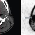 Un scanner cervical apporte confirmation et précise les éléments suivants : lésion de grand axe longitudinal supérieur à 4 cm, de dimensions transversales maximales voisines de 2 à 3 cm, retentissement sur la bifurcation carotidienne avec un écartement de l’origine des carotides externe et interne et un déplacement antérieur de la carotide externe, petites hypodensités centrales pouvant correspondre à un contingent nécrotique, sans lésion controlatérale (fig. A).