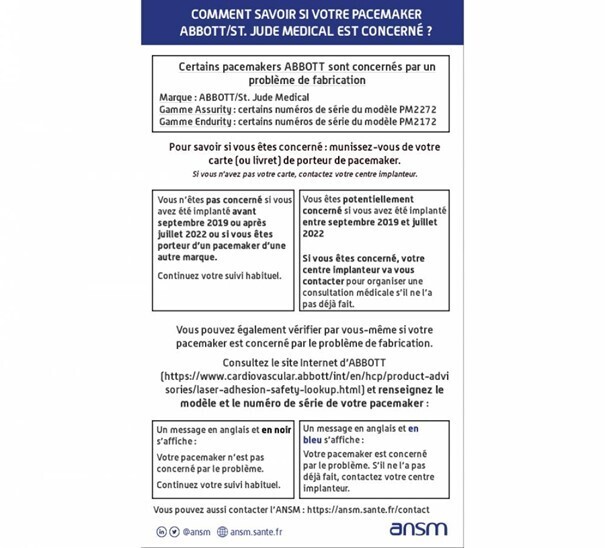 Attention : les patients implantés avant le 1er septembre 2019 avec les modèles en cause d’Abbott ou avec un pacemaker d’une autre marque ne sont pas concernés.
