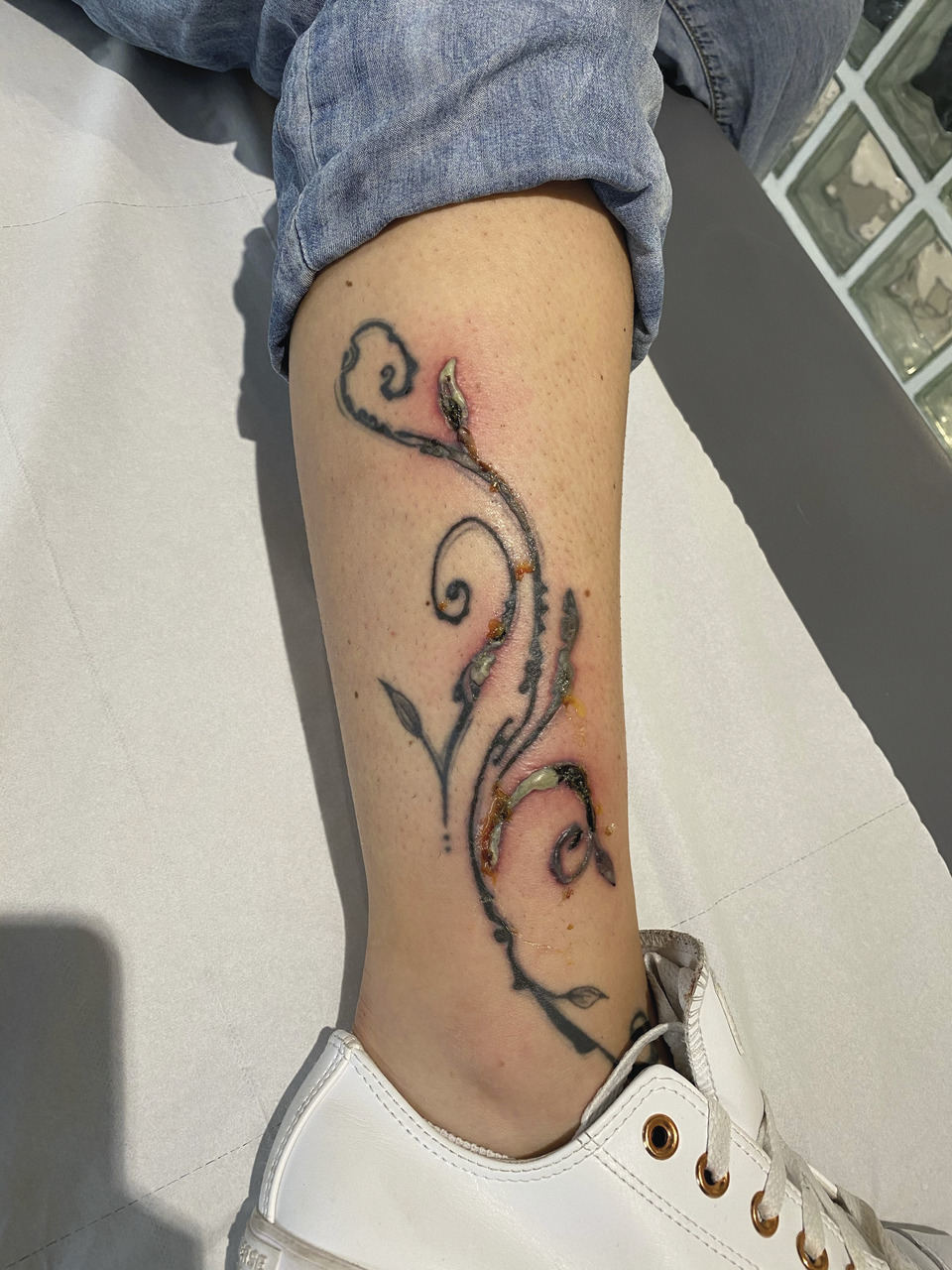 Mme S, 36 ans, consulte pour une plaie purulente, croûteuse, très douloureuse et mélicérique au niveau d’un tatouage de la jambe droite. Deux semaines auparavant, elle avait eu une dépilation des deux jambes au laser. À l’examen, il existe une adénopathie inguinale homolatérale. Un prélèvement cutané révèle la présence de Pseudomonas aeruginosa. Une double antibiothérapie de quinze jours a permis la guérison, au prix toutefois d’une cicatrice.