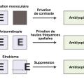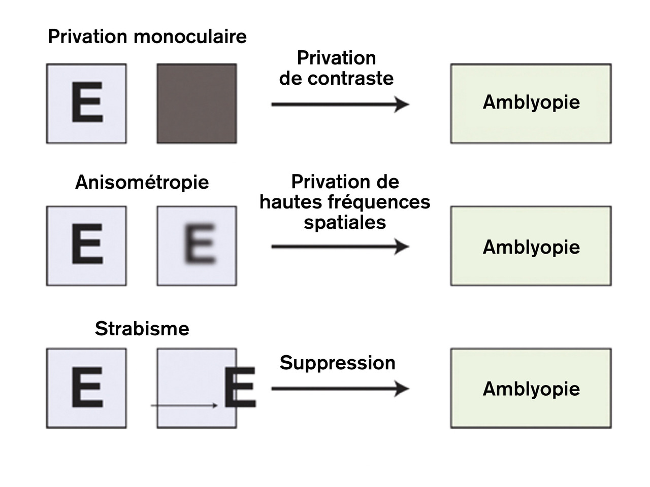 – l’amblyopie fonctionnelle est le témoin d’un conflit entre l’information visuelle provenant de l’œil droit et celle provenant de l’œil gauche, entraînant un défaut de synchronisation entre les images des deux yeux. Ce conflit est résolu par l’oubli d’une image de l’œil amblyope. Les principales causes sont dominées par l’anisométropie et le strabisme ;