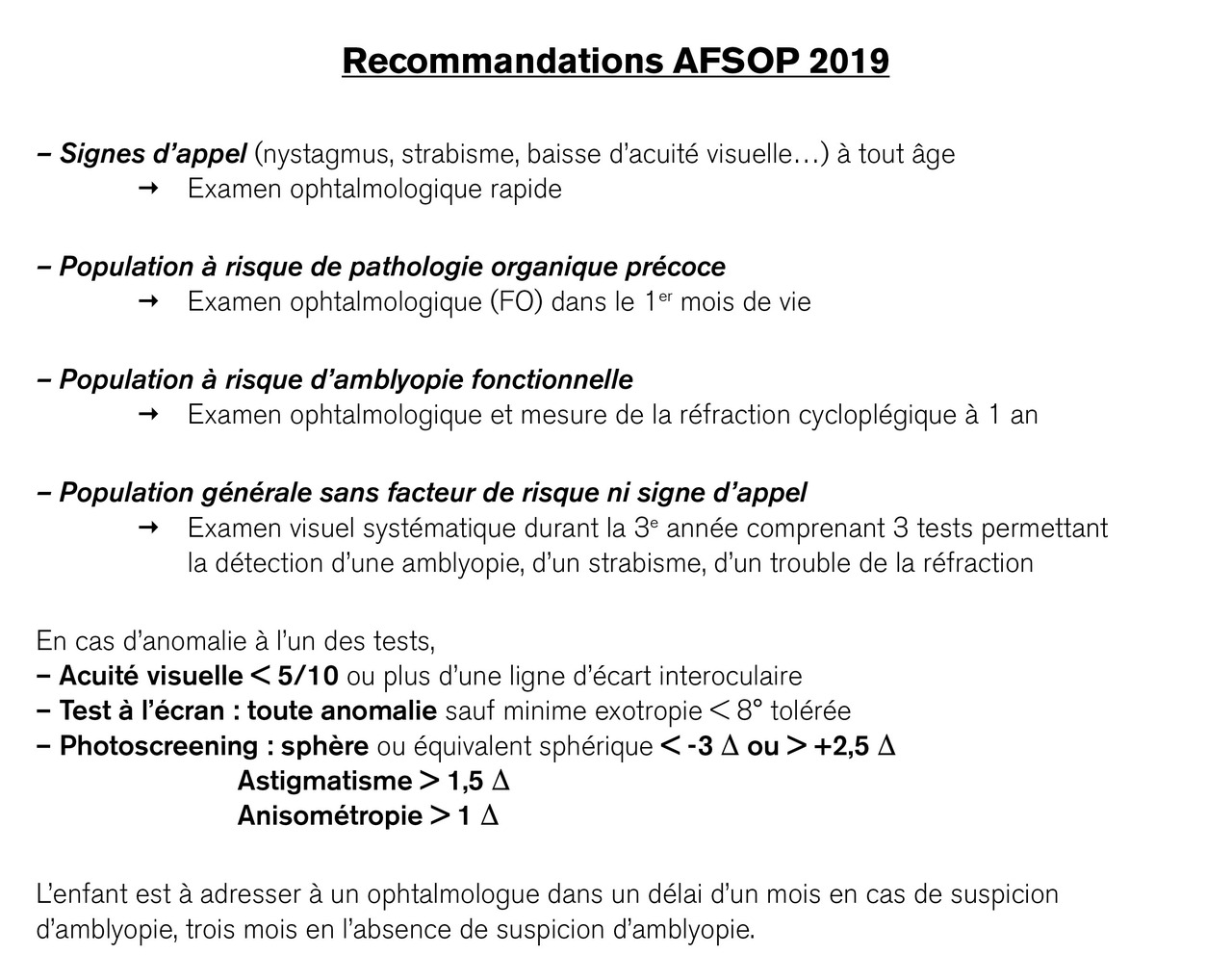 Ainsi, dans un objectif de détecter précocement l’amblyopie et ses facteurs de risque, l’AFSOP a émis des recommandations consensuelles en 2019, ayant comme buts principaux de sensibiliser les professionnels de santé aux signes d’appel devant motiver un examen ophtalmologique, de permettre un diagnostic précoce des pathologies organiques, de permettre une prévention de l’amblyopie fonctionnelle et de repérer les enfants à risque de développer des troubles visuels.