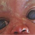 La présence d’une cornée opaque ou d’une mégalocornée (souvent « grands et beaux yeux » décrits par les parents) chez les nourrissons est également une urgence, la pathologie redoutée étant alors un glaucome congénital, dont la prise en charge est chirurgicale (fig. 4 ). La présence d’un larmoiement chronique et/ou d’une photophobie doit aussi faire craindre ce diagnostic.