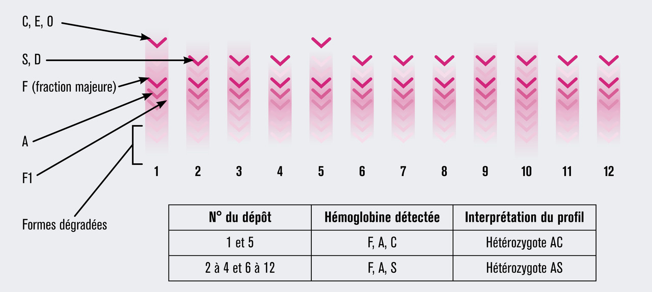 – les nouveau-nés atteints du syndrome drépanocytaire majeur ont une majorité d’HbF et de l’HbS, associées soit à une absence d’HbA (S/S ou S/b0-thalassémie), soit à de faible quantité d’HbA (S/b+-thalassémie), soit à de l’HbC (S/C), ou de l’HbO-Arab (S/O-Arab)…