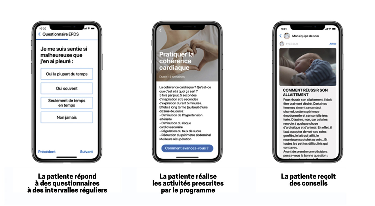 L’un des principaux facteurs de risque de la dépression du post-partum reste l’isolement des patientes après la sortie de maternité, contrastant avec l’hypermédicalisation du suivi pendant la grossesse, et pouvant être majoré par les périodes de confinement telles que celles récemment vécues en contexte de crise sanitaire liée au Covid-19. L’utilisation de nouvelles technologies comme les plateformes numériques (applications en ligne) constitue un moyen efficace de conserver un lien thérapeutique avec les patientes. Ces outils permettent notamment d’évaluer et de repérer les patientes ayant des facteurs de risque de symptômes psychiatriques, puis de les orienter vers des équipes spécialisées en santé mentale périnatale pour un suivi personnalisé.Un projet développé par notre équipe de psychiatrie périnatale Sorbonne Université propose la mise en place d’une application sur smartphone (
