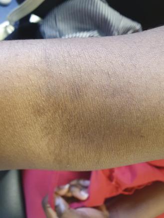 Nous remarquons une hyperpigmentation au niveau des plis et une légère hyperkératose (