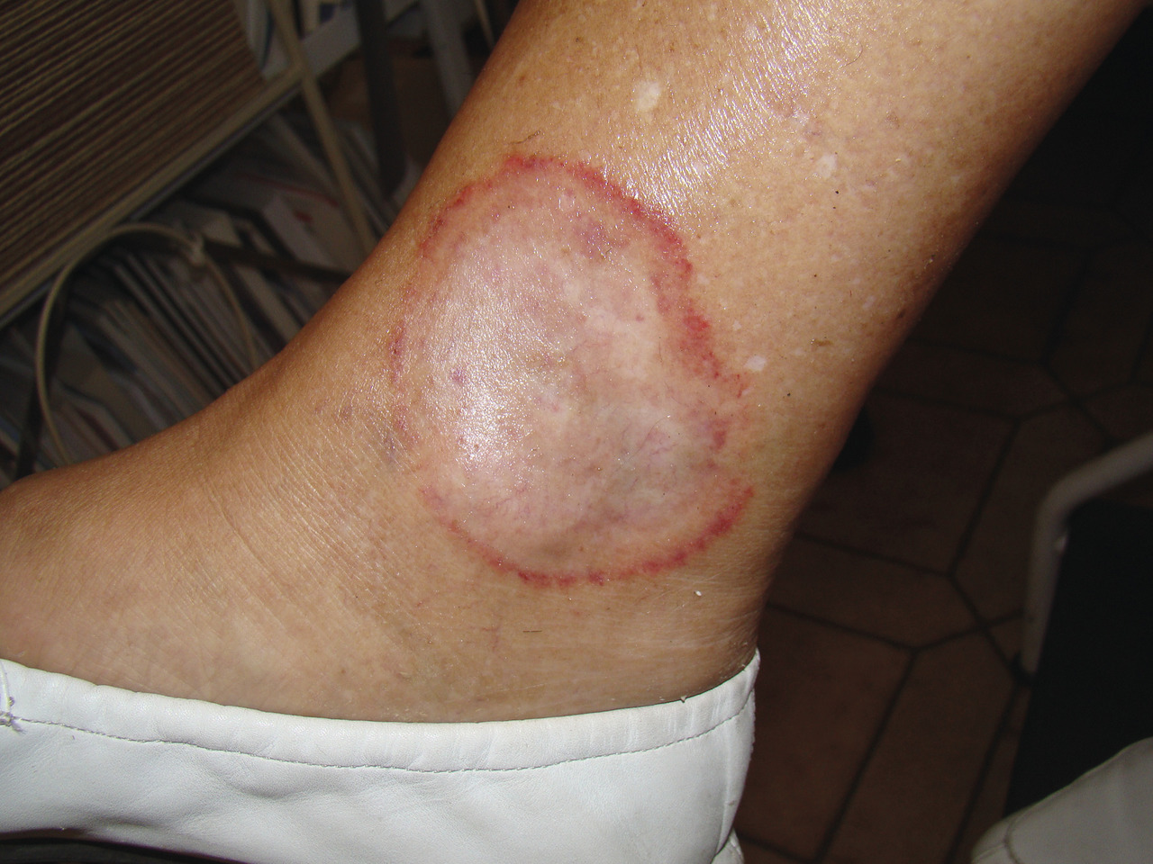 Simone, 62 ans, consulte pour une lésion siégeant au niveau du tiers inférieur de la jambe.