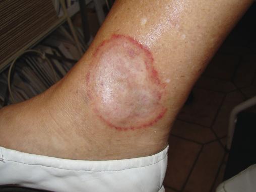 Après application d’un dermocorticoïde de classe 2 durant 3 semaines, les bords sont devenus très rouges ; le centre de la lésion semble atrophique et dépigmenté.