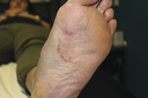 Monique, 63 ans, consulte pour une lésion prurigineuse apparue au niveau de la plante du pied, résistante aux dermocorticoïdes. Circulaire, ses bords sont délimités par un bourrelet constitué de vésicules et d’éléments hyper- kératosiques.