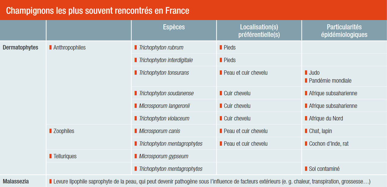 Les atteintes fongiques de la peau glabre peuvent être dues à 2 types de champignons : les levures du genre Malassezia et les dermatophytes (tableau).