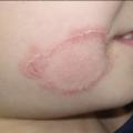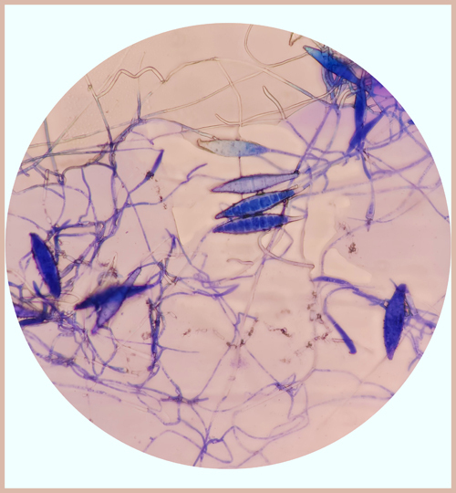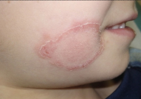 Les dermatophytes (Microsporum, Trichophyton) sont des champignons filamenteux pathogènes qui possèdent une affinité pour la kératine. Sur la peau, ils envahissent la couche cornée et évoluent de façon centrifuge en formant un anneau caractéristique. C’est le classique « herpès circiné » (figure 2). Les lésions sont typiquement arrondies, claires au centre, érythémato-squameuses en périphérie, et prurigineuses.