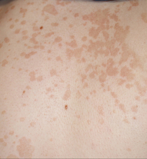 Les Malassezia sont des levures lipophiles, saprophytes de la peau, présentes dans les régions riches en glandes sébacées (haut du corps principalement). Elles peuvent se multiplier sous l’influence de certains facteurs (soleil, transpiration, grossesse …) et être responsables de petites taches achromiques et/ou hyperpigmentées. C’est le pityriasis versicolor (figure 1). Pour les présentations cliniques atypiques, le diagnostic peut être confirmé au laboratoire par la technique du scotch-test cutané qui met en évidence des levures en grappe associées à des filaments en microscopie optique. Le traitement repose sur l’application d’un antifongique topique sur tout le corps sous forme de shampoing en une seule application (kétoconazole unidose), éventuellement répétée 15 jours après et/ou avant un séjour au soleil. Il faut prévenir le patient de l’absence de repigmentation ou de dépigmentation immédiate afin d’éviter des traitements itératifs inutiles.