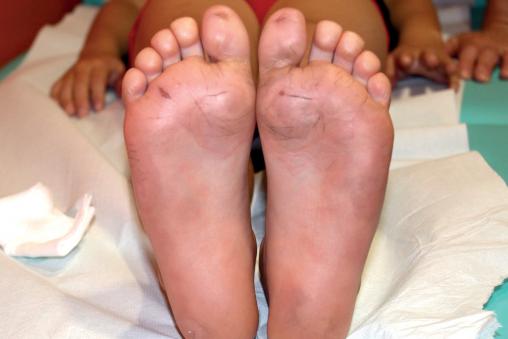 Le traitement est difficile : émollients (avec une faible concentration en urée), corticoïdes topiques (de niveau faible). Par ailleurs, il est important de conseiller au jeune patient de porter des chaussettes en coton et d’éviter les chaussures en caoutchouc.
