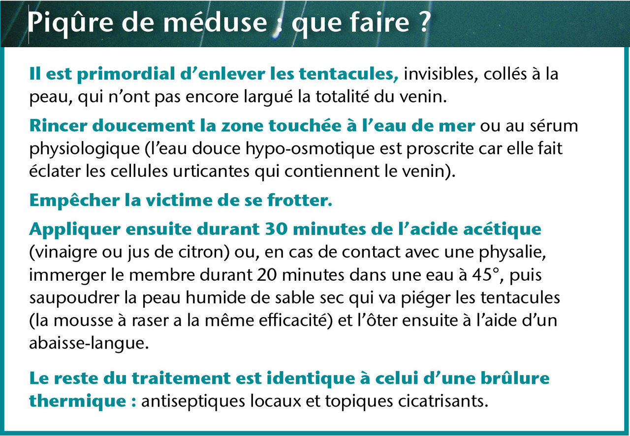 En cas d’inconscience, d’arrêt cardiorespiratoire, de collapsus, de trouble du rythme ou d’hypoventilation, de douleur intense (malgré une analgésie parentérale) ou d’atteinte majeure et extensive de la peau, le sérum antivenimeux « CSL Box jellyfish antivenom » est indiqué (non disponible en France).