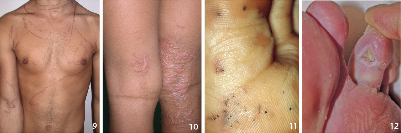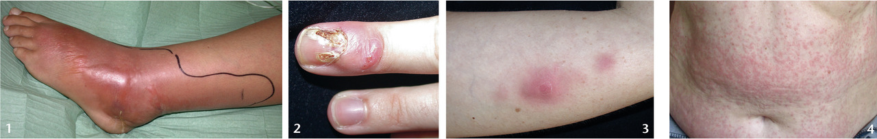 Dans plus d’un tiers des cas, les lésions sont multiples et se développent sur un trajet lymphatique du membre (dissémination sporotrichoïde ;