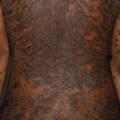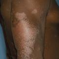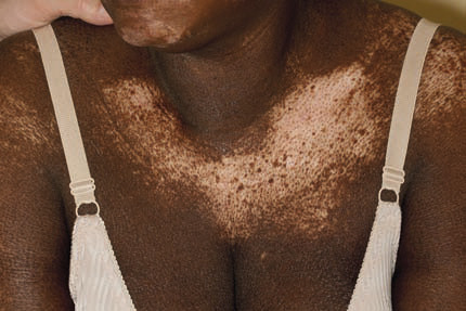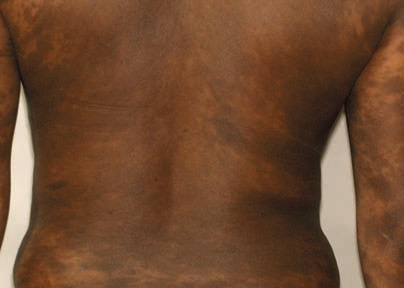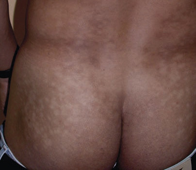 À la différence de l’hyperpigmentation, l’hypopigmentation a un nombre restreint de causes (en dehors des troubles pigmentaires primitifs communs aux peaux claires : vitiligo, albinisme…). On peut citer les banales eczématides hypochromiantes (appelées aussi dartres, ou pityriasis alba) (fig. 5), mais aussi le psoriasis (fig. 6), la dermite séborrhéique, le pityriasis lichénoïde, le mycosis fongoïde (lymphome T épidermotrope), des inflammations granulomateuses comme la lèpre, la sarcoïdose ou le lichen nitidus, le lupus érythémateux ou la sclérodermie systémique (fig. 7). L’hypomélanose maculeuse confluente progressive est un tableau bien particulier touchant les phototypes 4 à 5 (peau mate/brune) : macules non squameuses hypochromes, non prurigineuses, prédominant sur le tronc (volontiers aux lombes) ; elles surviennent à l’adolescence pour se stabiliser, voire s’atténuer à l’âge adulte (fig. 8). D’autres observations sémiologiques n’ont pas été confirmées par des études rigoureuses : le pityriasis rosé serait souvent micropapuleux diffus, la dermatite atopique d’aspect papuleux lichénoïde ou psoriasiforme, etc.