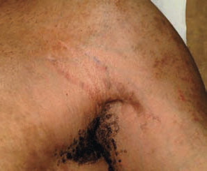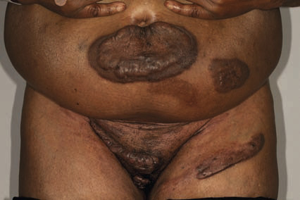 Les chéloïdes sont des lésions fibroprolifératives intradermiques extensives qui se développent le plus souvent à partir d’un traumatisme ou d’une folliculite (fig. 9). Volontiers multiples, elles sont globalement plus importantes sur les peaux pigmentées, en fréquence, volume et gravité, particulièrement chez les sujets d’origine africaine. Les signes fonctionnels sont parfois intenses : prurit insupportable, douleur de type neurogène, sensibilité allodynique. Les lésions, chroniques, ont tendance à s’étendre et récidivent avec une aggravation presque systématique après destruction ou exérèse. Les injections intralésionnelles de corticoïdes sont le traitement de référence à l’heure actuelle.
