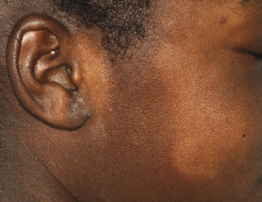 Hyper- et hypopigmentations de la peau claire font partie des troubles pigmentaires qui sont majoritairement dus à des anomalies primitives du système mélanocytaire. Sur peau foncée, les causes de ces troubles sont beaucoup plus variées, comprenant presque toute la pathologie cutanée.1 Une pigmentation mélanique très intense limite la visibilité des couleurs. L’érythème (fig. 1) apparaît souvent comme une zone « plus foncée », d’autant que l’inflammation provoque une hyperpigmentation. En cas d’érysipèle ou d’exanthème, il faut bien écouter le malade – qui peut lui-même juger « rouge » une lésion qu’on perçoit comme « noire » – et toucher sa peau (augmentation de chaleur locale liée à la vasodilatation). De plus, la difficulté à distinguer les couleurs peut limiter la validité des scores cliniques ; par exemple, la sévérité de la dermatite atopique serait sous-estimée chez les enfants à peau foncée.