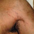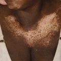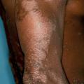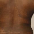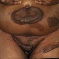 Il faut décourager l’emploi de topiques affichant des propriétés éclaircissantes. S’il s’agit de produits autorisés en France en tant que cosmétiques, leur efficacité ne sera pas suffisante. Inversement, s’ils sont efficaces, cela signifie qu’ils contiennent des substances interdites ou qui devraient relever d’une prescription médicale (hydroquinone, corticoïdes).2 L’application de corticoïdes favorise l’apparition ou l’aggravation de dermatoses infectieuses : dermatophyties (fig. 10), gale, érysipèle, pityriasis versicolor, etc. Vergetures, acné cortisonée et atrophie cutanée sont très courantes (fig. 11). L’hydroquinone peut être responsable d’une ochronose exogène : faite de placards pigmentés (fig. 12), qui par la suite s’infiltrent et prennent un relief granuleux, elle est liée à des applications prolongées de produits sur des régions photo-exposées (front, zones malaires, haut du dos).