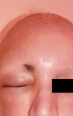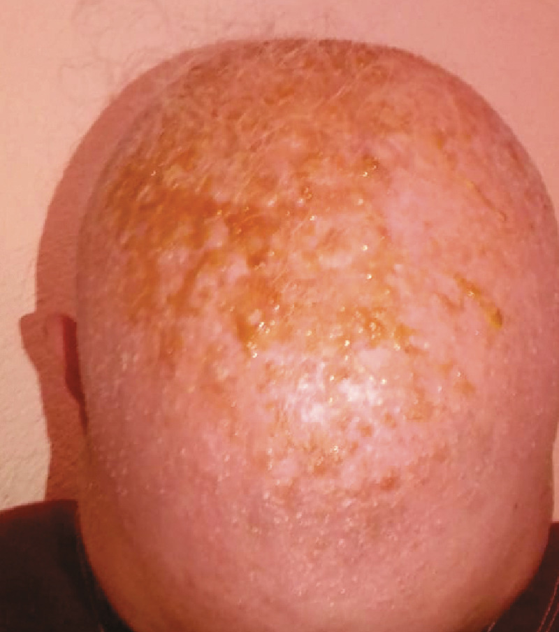 Ce patient de 20 ans consultait pour une pelade décalvante du cuir chevelu atteignant également les sourcils, la barbe et les membres inférieurs. Un traitement associant bolus de corticoïdes (500 mg de Solumédrol dans 500 cc de sérum salé) et minoxidil 2 % au niveau du cuir chevelu (minoxidil et propylène glycol) a été débuté. 72 heures plus tard, un œdème déformait son visage et des lésions apparaissaient au niveau du cuir chevelu (