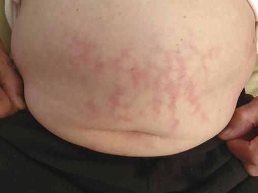 À l’examen, on note une lésion érythémateuse quadrillée étendue sur l’abdomen (figure).