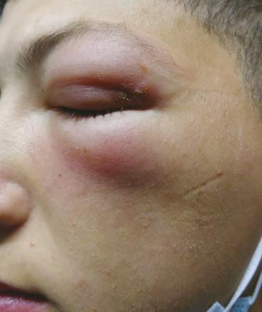 Un patient de 19 ans, militaire en opération extérieure, consulte pour un gonflement douloureux de la paupière supérieure gauche depuis deux jours. À l’examen, on observe un érythème et un œdème ; la lésion primaire a un aspect d’amas vésiculaire blanchâtre (fig. 1 ). Le lendemain, les signes inflammatoires ont diffusé au niveau de la paupière inférieure, l’empêchant d’ouvrir l’œil (fig. 2 ). Le patient est apyrétique, sans syndrome méningé, ni trouble de l’oculomotricité, ni baisse d’acuité visuelle. Après un avis ophtalmologique, le scanner facial montre une dermo-hypodermite périorbitaire préseptale, éliminant une atteinte rétroseptale.