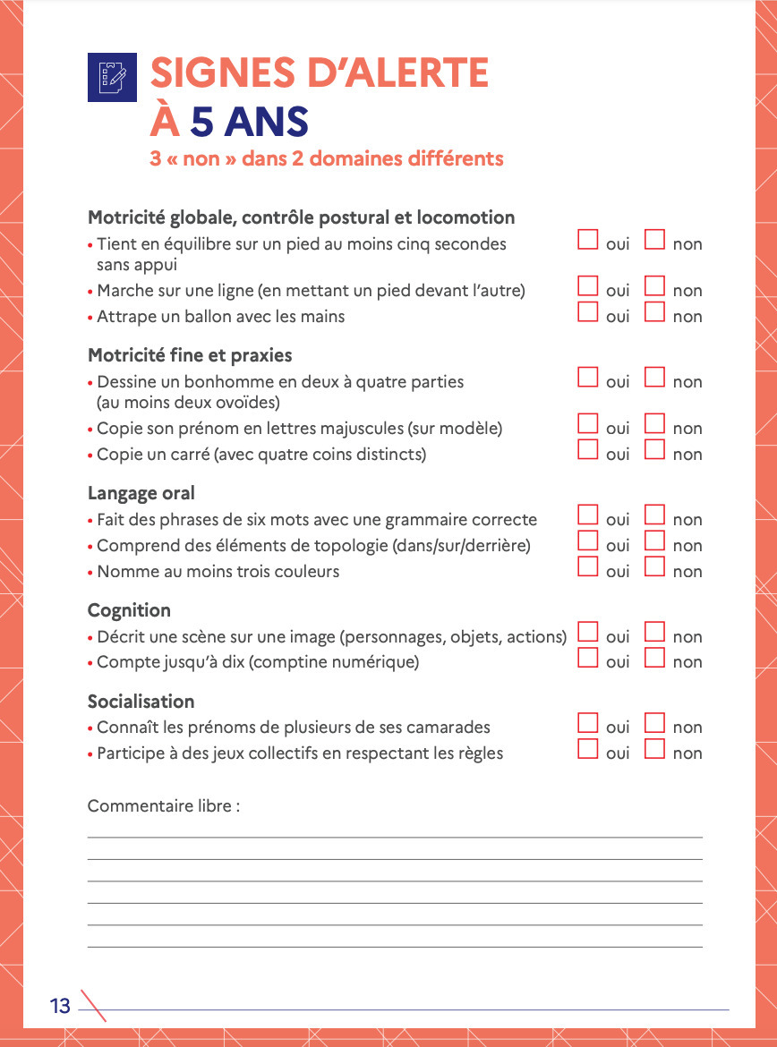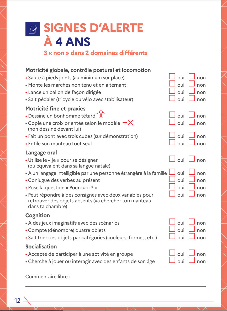- entre 4 et 6 ans : 3 signes dans au moins 2 des 5 domaines de développement.