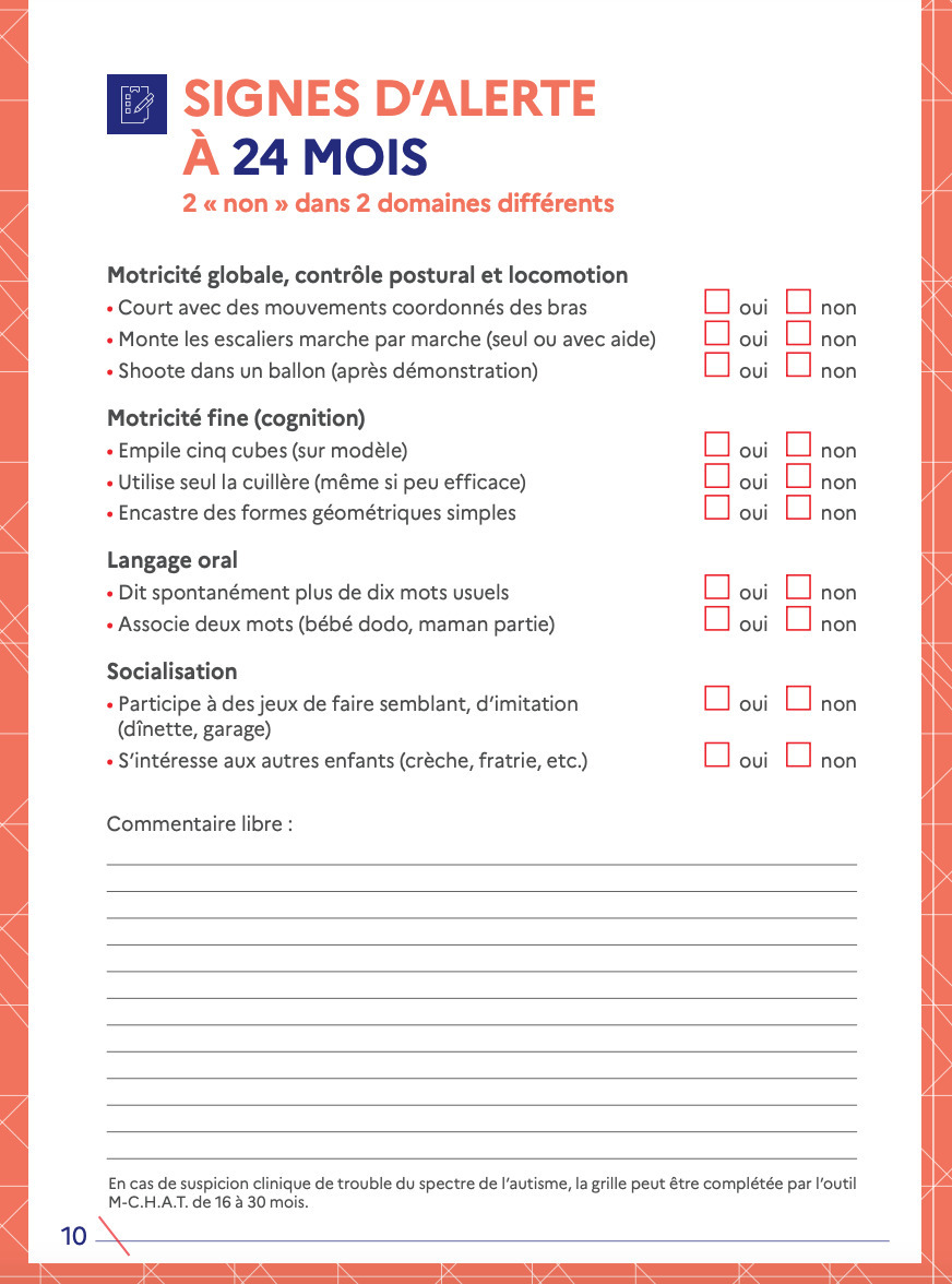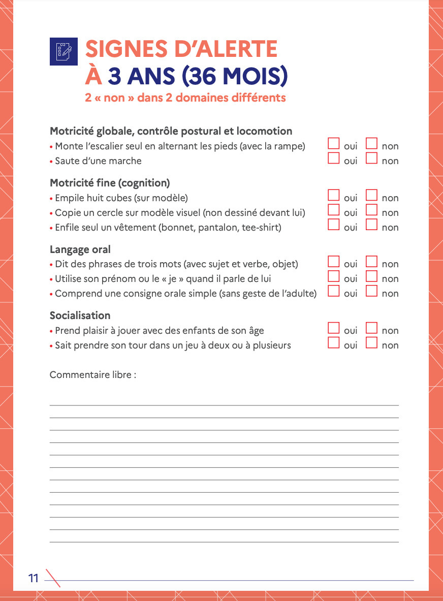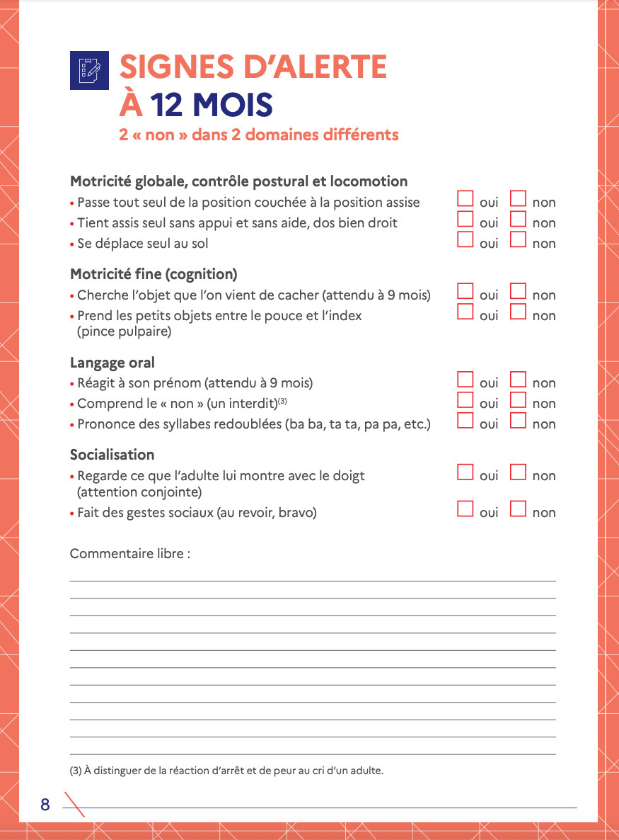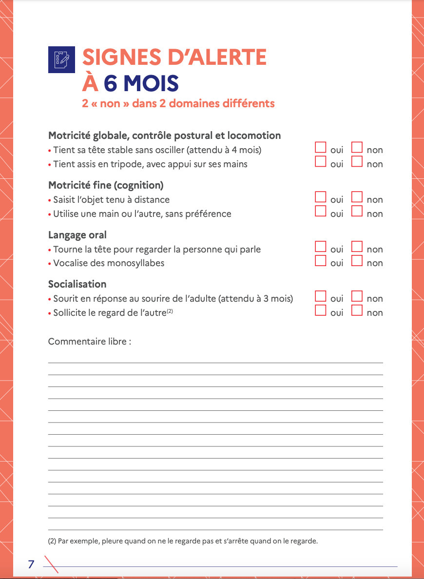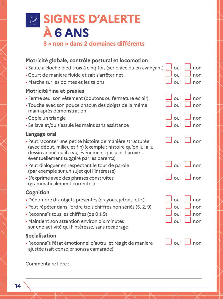 - signes d’alerte en fonction de l’âge (6, 12, 18, 24 mois ; 3, 4, 5 et 6 ans) ;