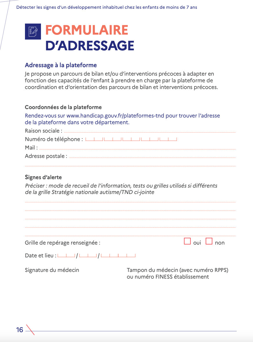Leur repérage précoce est crucial, pour permettre une prise en charge qui sera d’autant plus efficace qu’elle sera aussi précoce. Les médecins traitants sont en première ligne, en particulier durant les premières années de l’enfant. C’est pourquoi le gouvernement a élaboré à leur destination une grille de repérage très simple, qui s’insère dans un dispositif complet permettant d’engager, sans attendre la stabilisation du diagnostic, l’intervention coordonnée de plusieurs professionnels de santé via des plateformes de coordination territoriales (v. ci-dessous).