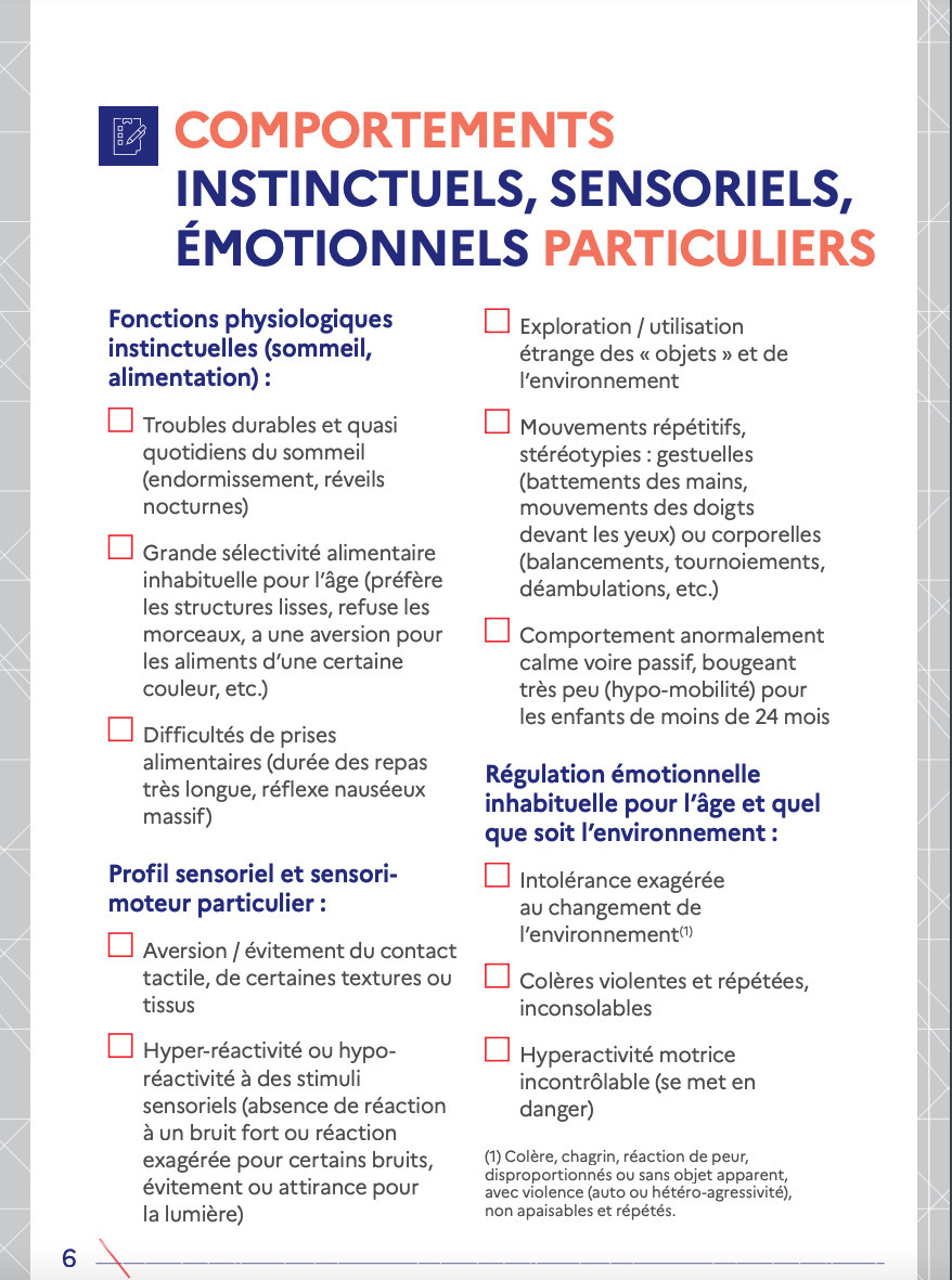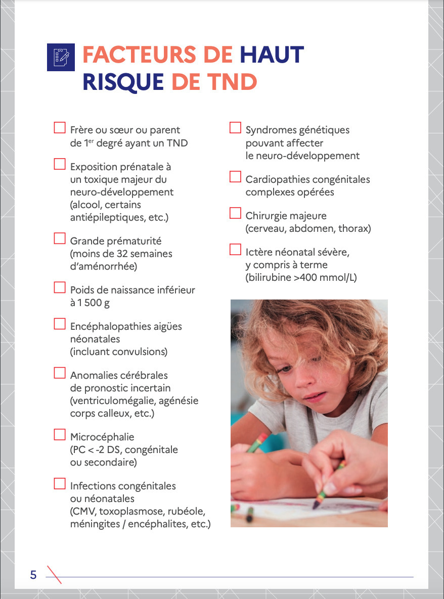Ces signes d’alerte sont regroupés, selon l’âge, en 4 ou 5 domaines de développement (motricité globale, contrôle postural et locomotion ; motricité fine ; langage ; socialisation ; cognition à partir de 4 ans) et 2 dimensions pertinentes quel que soit l’âge : facteurs de haut risque de TND, comportements instinctuels, sensoriels et émotionnels particuliers.