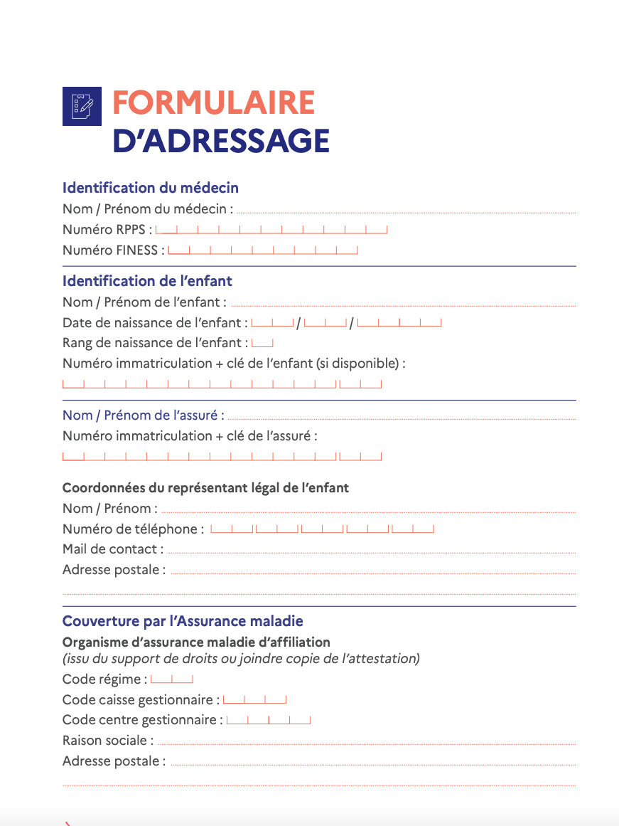 Une fois les quatre parties du document renseignées par le médecin, celui-ci est à transmettre à la plateforme ainsi qu’à la famille (v. fiches ci-contre) :