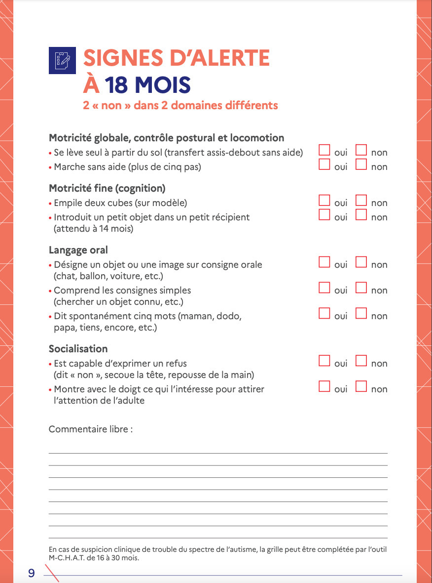 Le but de ce repérage est de porter l’attention sur des points clés du développement global de l’enfant. La grille comporte ainsi des indicateurs quel que soit l’âge de l’enfant ainsi que de signes d’alerte en fonction de l’âge, et un formulaire d’adressage vers la plateforme.