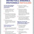 Les comportements instinctuels, sensoriels et émotionnels particuliers ne sont pas rattachés à un âge donné et ont été regroupés comme des marqueurs associés aux TND : ce sont leur sévérité ou le caractère durable qui doivent attirent l’attention des parents et des professionnels ; aucun de ces signes pris de façon isolée n’a de valeur prédictive.