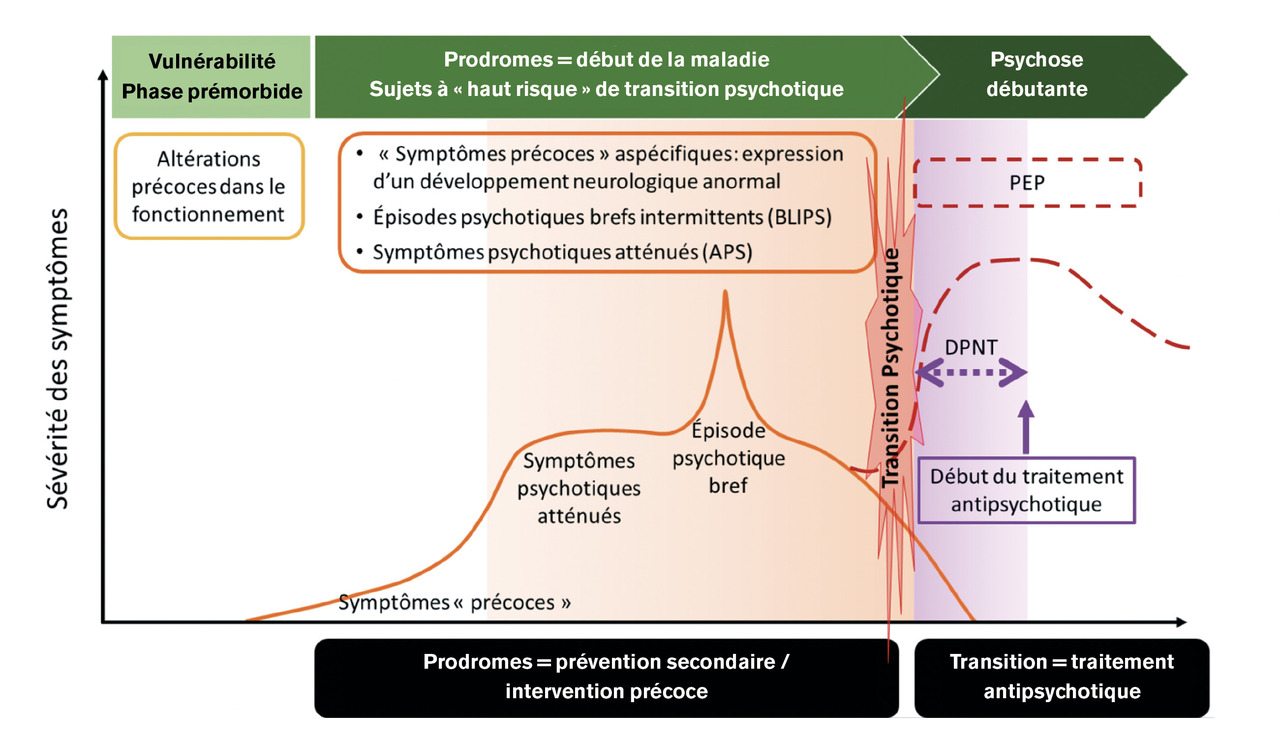 L’absence de percée thérapeutique dans le traitement de la schizophrénie a incité à développer des mesures de prévention. Ces dernières ont pour objectif d’anticiper et de prévenir l’évolution d’une pathologie. Il s’agit d’une approche a priori ou proactive. Dans le cas de la schizophrénie, la prévention peut débuter dès la manifestation des premiers symptômes afin de s’opposer à l’évolution de la maladie. Il s’agit de prévention secondaire. Elle fait appel à la détection des troubles et à l’intervention précoce. Elle est actuellement possible du fait des connaissances croissantes sur l’évolution de la maladie (fig. 1 ) et notamment sur les symptômes précoces ou prodromes. Les phases débutantes de la schizophrénie sont ainsi devenues une période d’opportunité pour améliorer le pronostic de la maladie à court, moyen et long terme.