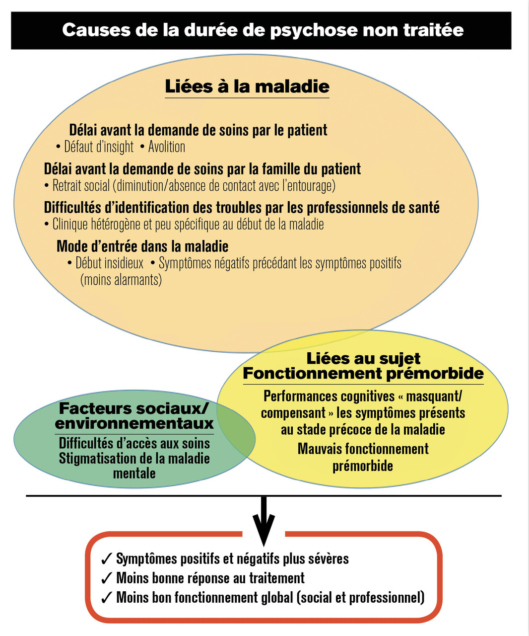 Le mode d’entrée dans la maladie peut être brutal, le diagnostic et l’adressage des patients sont alors relativement faciles et rapides, mais, dans la majorité des cas, il est progressif. L’étalement des changements en lien avec les symptômes de la maladie sur plusieurs mois ou années est souvent à l’origine d’un retard au diagnostic. Il faut donc être particulièrement vigilant à certains changements, même minimes ; ils peuvent concerner les perceptions d’une personne, l’apparition d’altérations cognitives pouvant être responsables de ruptures scolaires ou professionnelles. De même, une maladie évoluant progressivement, débutant par des symptômes négatifs (fig. 1 ), moins bruyants, moins connus et présents dans d’autres pathologies comme la dépression, est également à l’origine d’un retard au diagnostic.