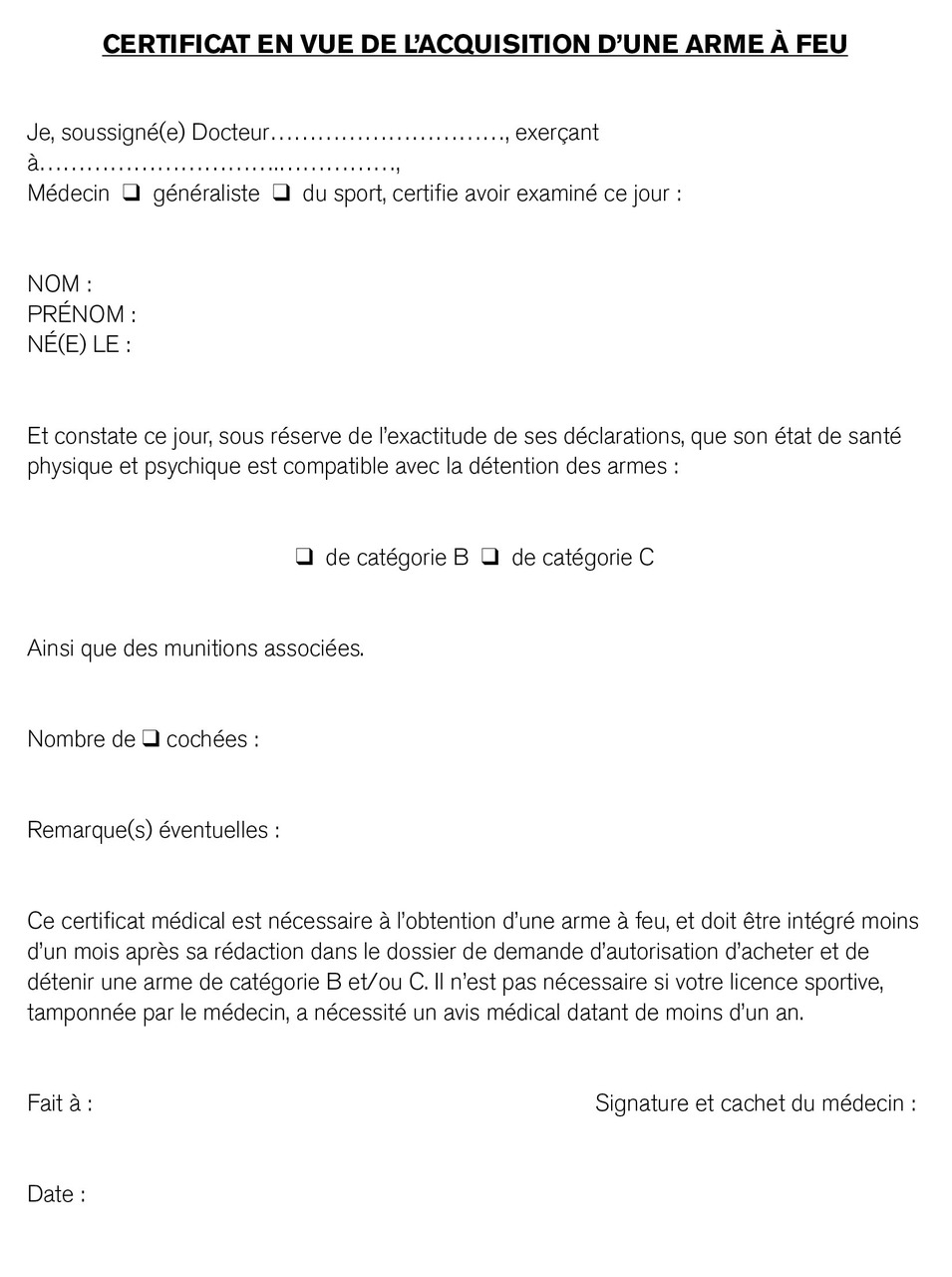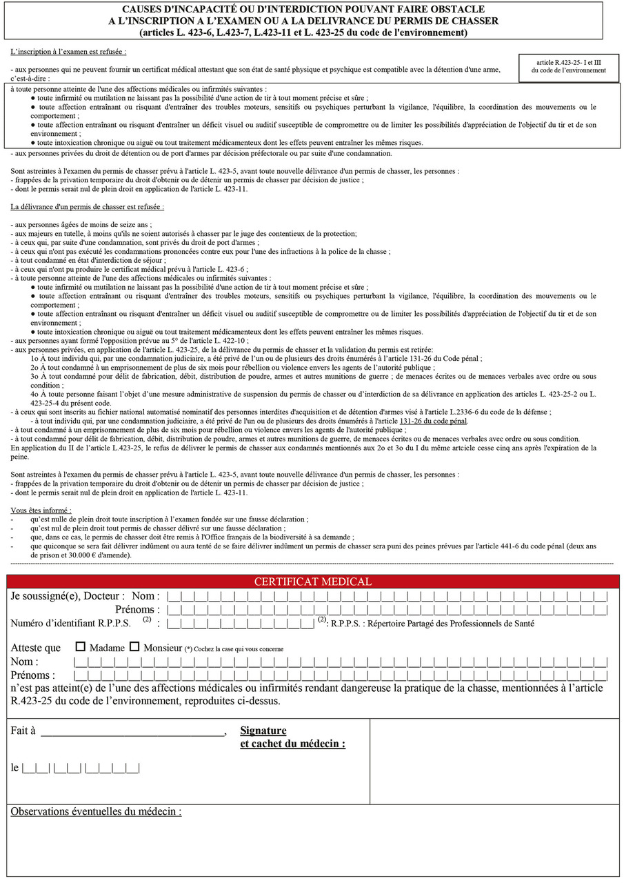 Pour l’acquisition et la détention de certaines armes à feu, ainsi que l’inscription à l’examen du permis de chasse, un certificat médical est nécessaire.
