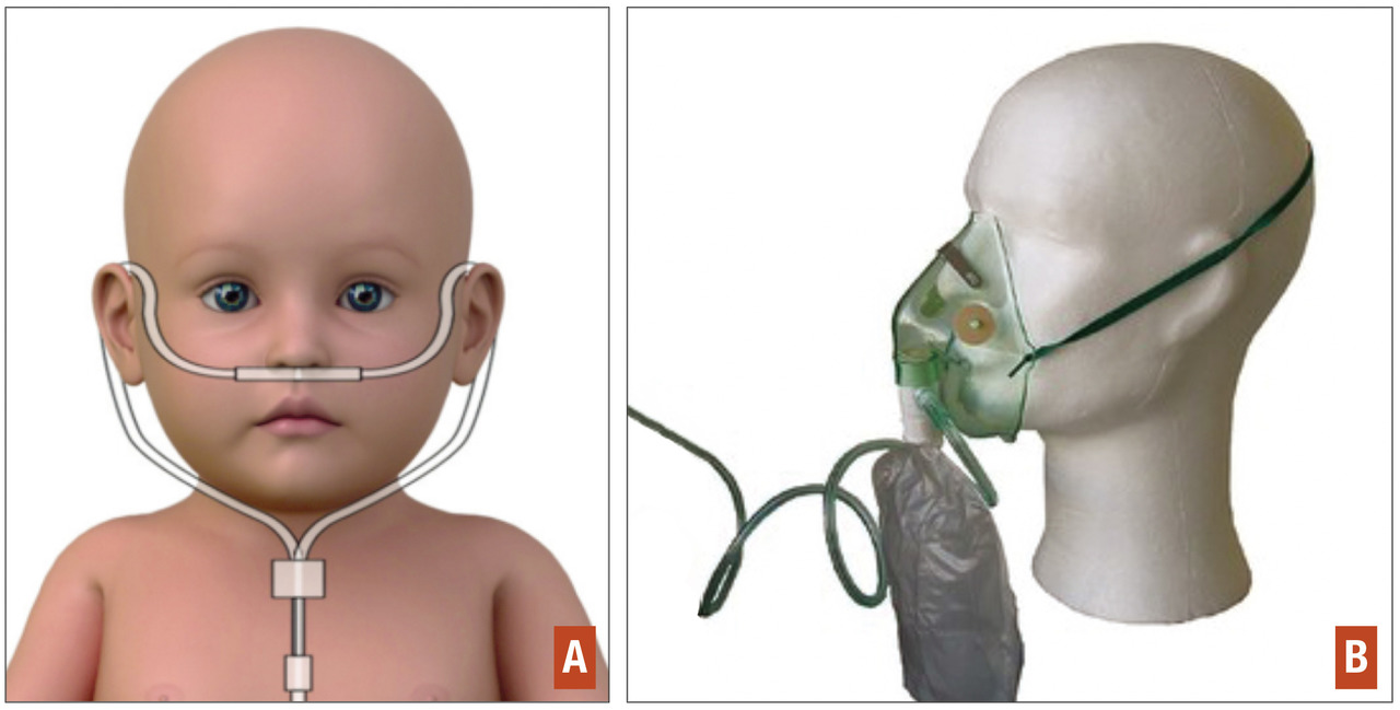 Dès son arrivée, 3 mesures sont nécessaires pour faciliter la respiration et permettre une bonne oxygénation (positionnement, désobstruction, oxygénation). L’enfant doit être positionné au calme, en position demi-assise. En cas de détresse respiratoire, il ne doit jamais être positionné en décubitus dorsal. Les voies aériennes supérieures doivent être libérées (aspiration nasopharyngée si nécessaire). Si nécessaire, une oxygénothérapie avec pour objectif une SpO2 > 91 % doit être mise en place avec un support adapté (fig. 2). L’examen clinique et la réalisation des gaz du sang permettent d’évaluer la nécessité d’une prise en charge réanimatoire. Dès la cause de la détresse respiratoire identifiée, un traitement spécifique doit être mis en place.