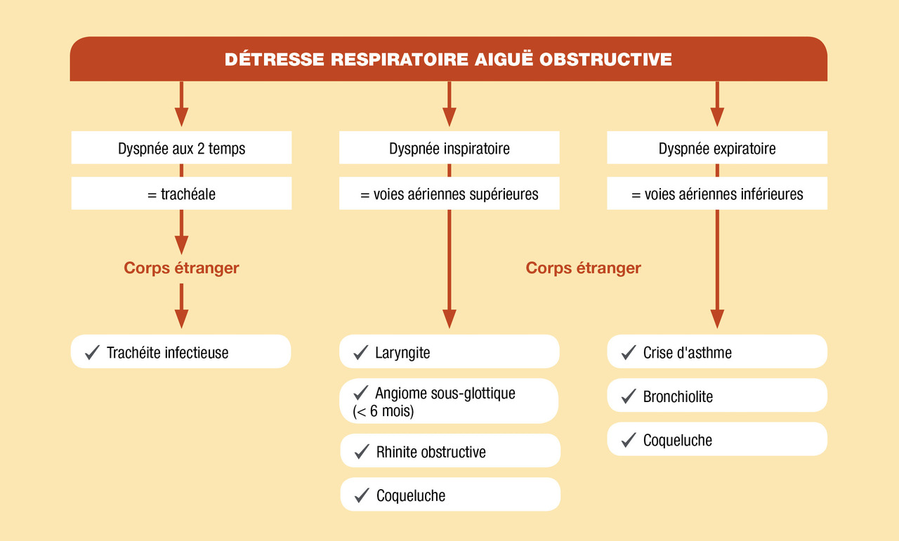 Les causes principales de détresse respiratoire obstructive du nourrisson et de l’enfant sont rapportées dans la fig. 1.
