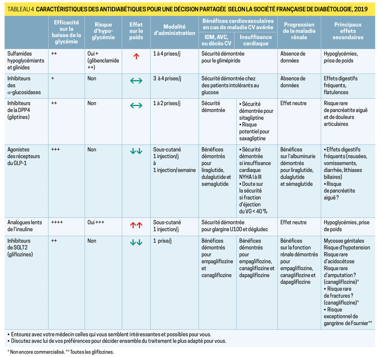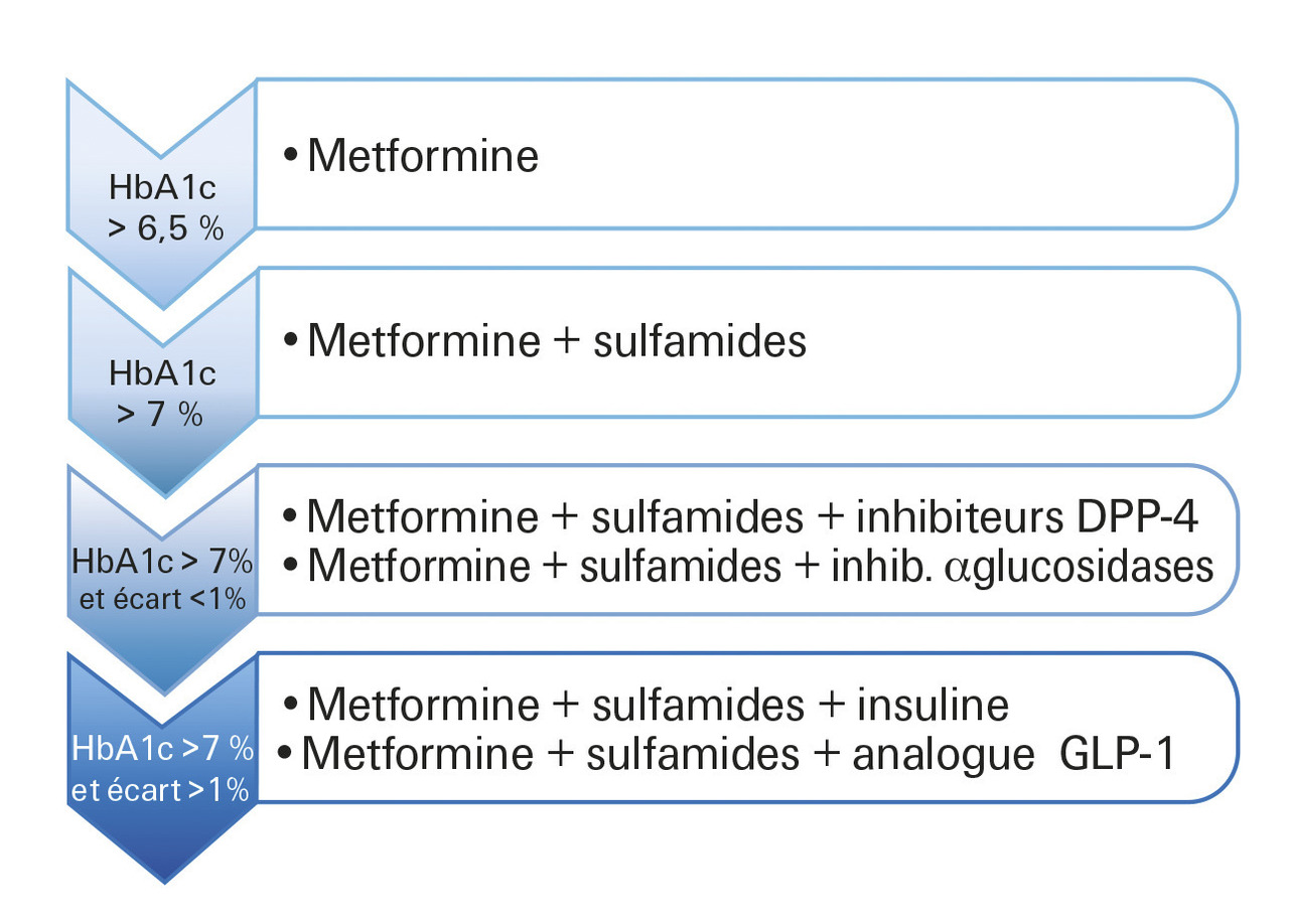 En cas de contre-indication à la metformine ou si l’objectif glycémique n’est pas atteint, on dispose de plusieurs options (tableau 4 ) :