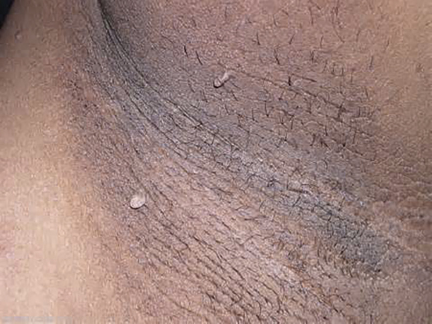 Chez les sujets jeunes, un acanthosis nigricans (fig. 1 ) est un argument majeur témoignant de l’insulinorésistance du diabète de type 2.