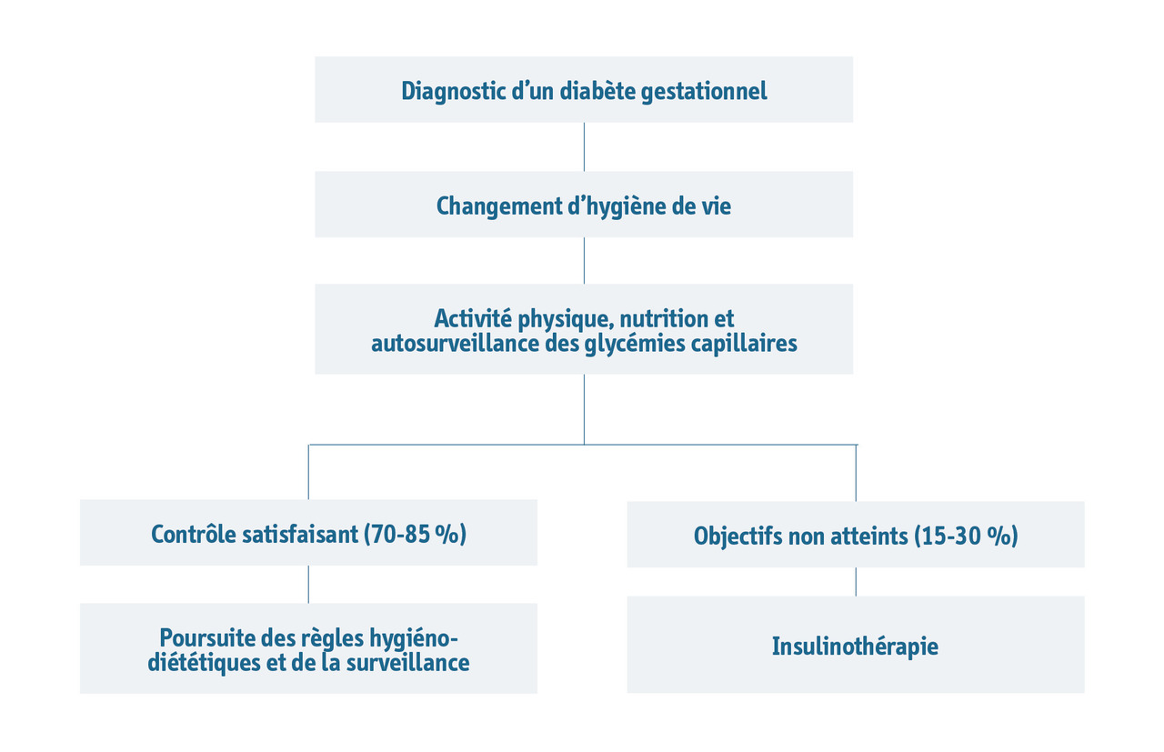 Dans un premier temps, la prise en charge est hygiénodiététique. Il n’existe pas d’approche diététique universelle, et la prise en charge doit être personnalisée. En réalité, il ne s’agit pas de prescrire, comme on le voit parfois, un régime alimentaire mais d’amener à une alimentation équilibrée normocalorique d’environ 1 800 à 2 000 kcal/j, réparties en trois repas et, si souhaité, une ou deux collations, avec 15 à 20 % de protéines, 40 à 45 % de glucides en favorisant les sucres lents, et 40 % de lipides. De l’exercice et une activité physique adaptés à la grossesse et à la patiente sont à encourager. Ces changements d’hygiène de vie ont démontré un effet sur la réduction de l’hypertension artérielle, de la prématurité, de la macrosomie (sans augmenter les retards de croissance intra-utérins) mais aussi une amélioration du sommeil et des douleurs lombaires de la femme enceinte.