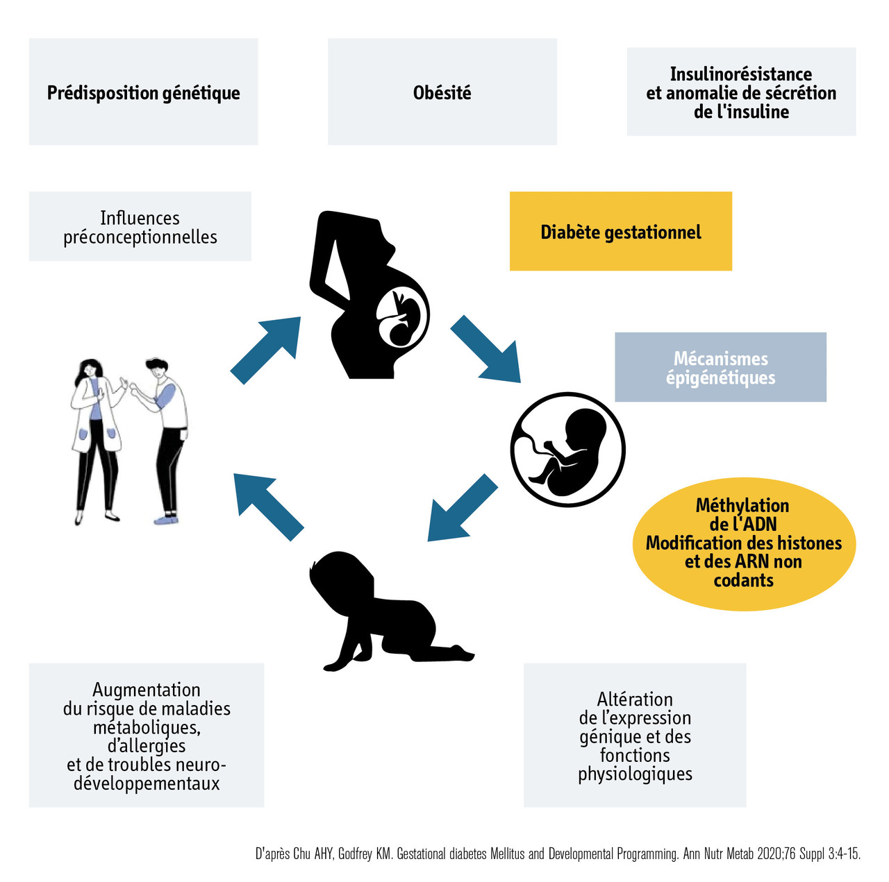 À l’âge adulte, les enfants nés de mères ayant eu un diabète gestationnel pourraient avoir un risque modéré augmenté de surpoids, d’obésité et de diabète de type 2. Le diabète gestationnel serait associé à plus d’allergies (dermatite atopique, troubles respiratoires) chez ces enfants. Des données contradictoires interrogent sur un possible risque accru de trouble du spectre de l’autisme. Les mécanismes de ces pathologies suggèrent une programmation fœtale au travers de mécanismes épigénétiques (Prise en charge du diabète gestationnel