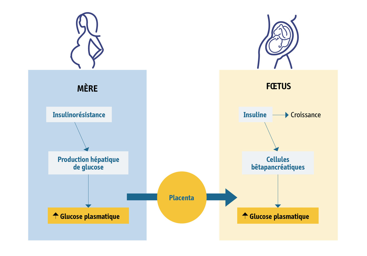 La macrosomie est la principale conséquence néonatale démontrée d’un diabète gestationnel.Les hyperglycémies maternelles se traduisent par des hyperglycémies fœtales de même degré et entraînent une sécrétion accrue d’insuline fœtale (hyperinsulinisme), qui agit sur la croissance fœtale. C’est l’hypothèse de Pedersen (