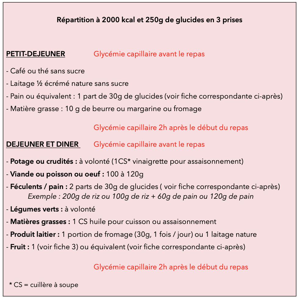 Une répartition en minimum 3 repas semble le moyen le plus adapté pour à la fois couvrir les besoins nutritionnels, mieux répartir les apports glucidiques journaliers pour éviter les hyperglycémies postprandiales ainsi que les périodes de jeûne prolongées (> à 12 heures), et limiter néoglucogenèse et cétose.