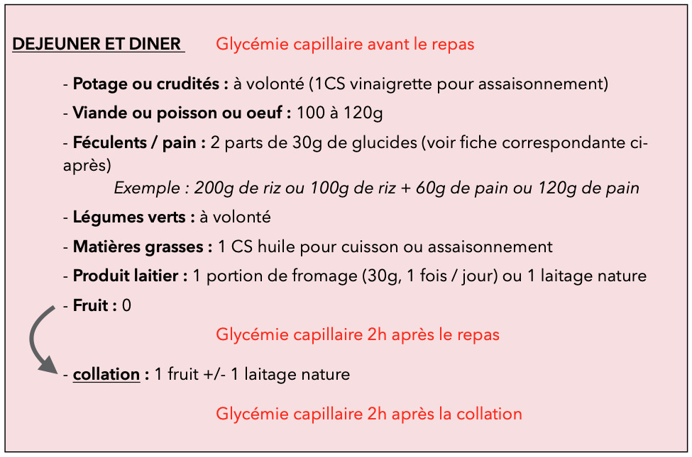 Des glycémies capillaires pré- et postprandiales à chaque repas (4-6 fois/j) doivent être faites par autosurveillance, pendant 7 à 15 jours : si les objectifs glycémiques (v. encadré 2) ne sont pas atteints, une insulinothérapie est alors proposée, tout en poursuivant le contrôle alimentaire selon les mêmes principes (ci-dessous).