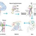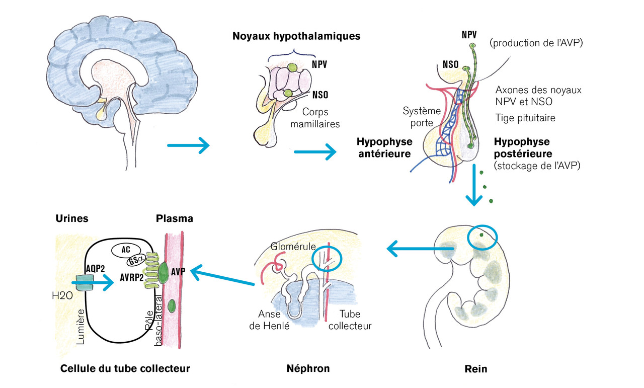 La capacité de concentration urinaire est dépendante de l’hormone antidiurétique (ADH), également appelée arginine vasopressine (AVP). Cette hormone peptidique, synthétisée par l’hypothalamus au niveau des noyaux supra-optiques et paraventriculaires, est ensuite stockée et libérée par la posthypophyse ; elle cible en particulier les récepteurs V2 du néphron distal dans le tubule collecteur (