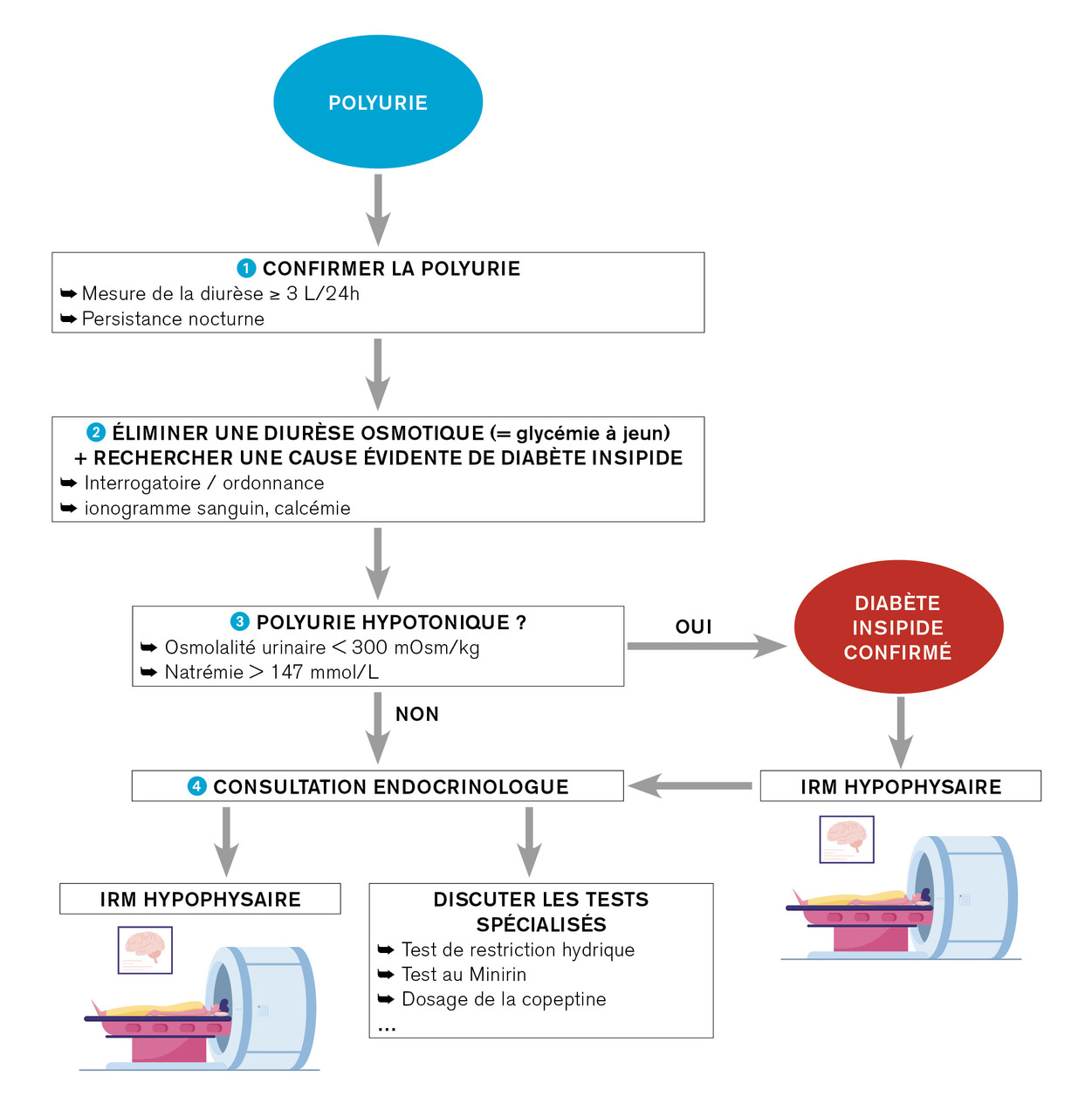 Le plus souvent, le diagnostic repose sur des éléments simples : interrogatoire, courbes d’hydratation et de diurèse, osmolalités plasmatique et urinaire, IRM hypophysaire. Les tests et examens spécialisés ne sont indiqués qu’en cas de suspicion de formes partielles.