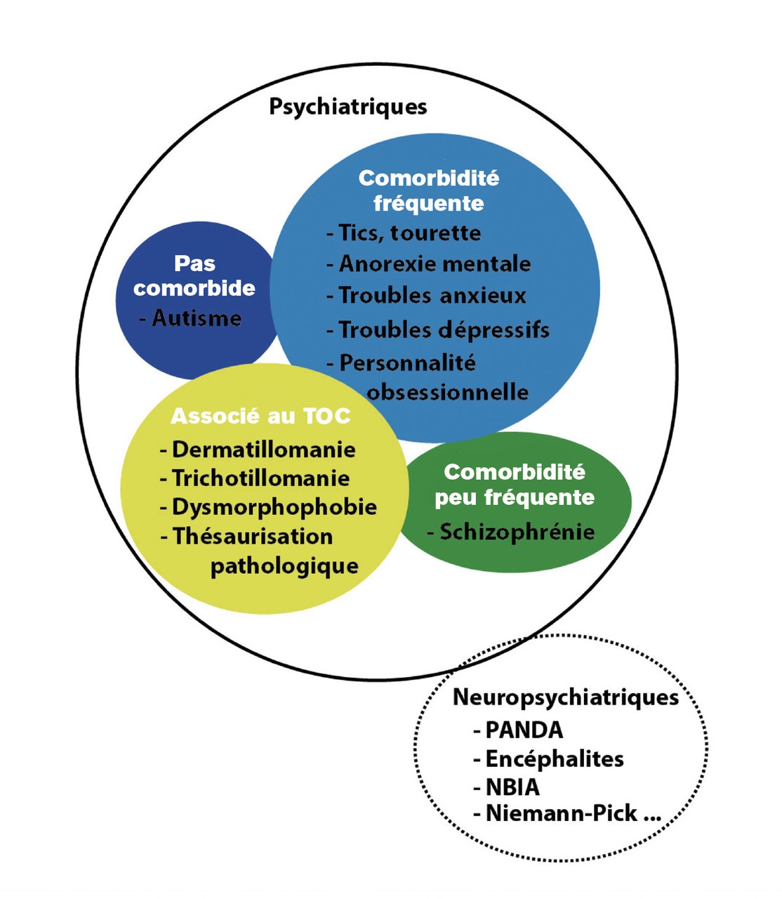 Certains TOC sont secondaires à des maladies neuropsychiatriques complexes auto-immunes ou paranéoplasiques (encéphalites à anticorps anti-D2R), post-infectieuses (paediatric autoimmune neuropsychiatric disorders associated with streptococcus infections), ou métaboliques (neurodegeneration with brain iron accumulation, homocystinurie et maladie de Niemann-Pick). L’anormalité de l’examen neurologique et de l’imagerie par résonance magnétique encéphalique sont alors des éléments d’orientation importants.