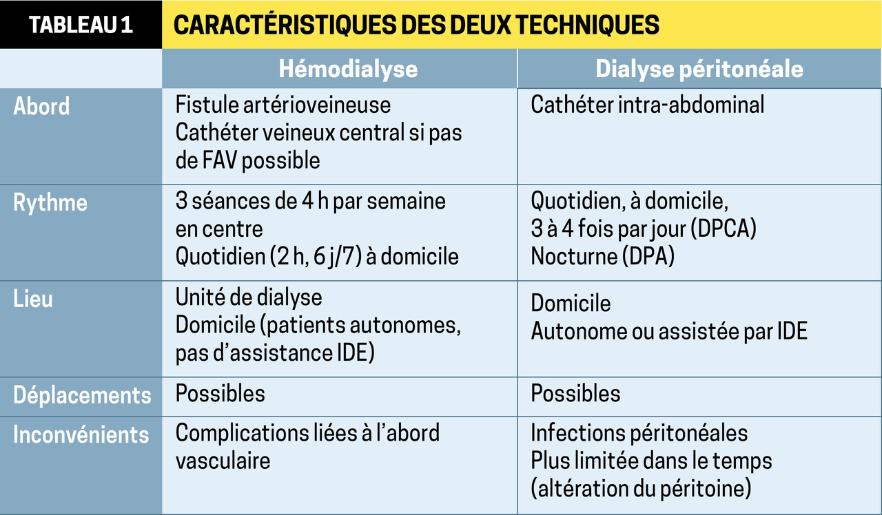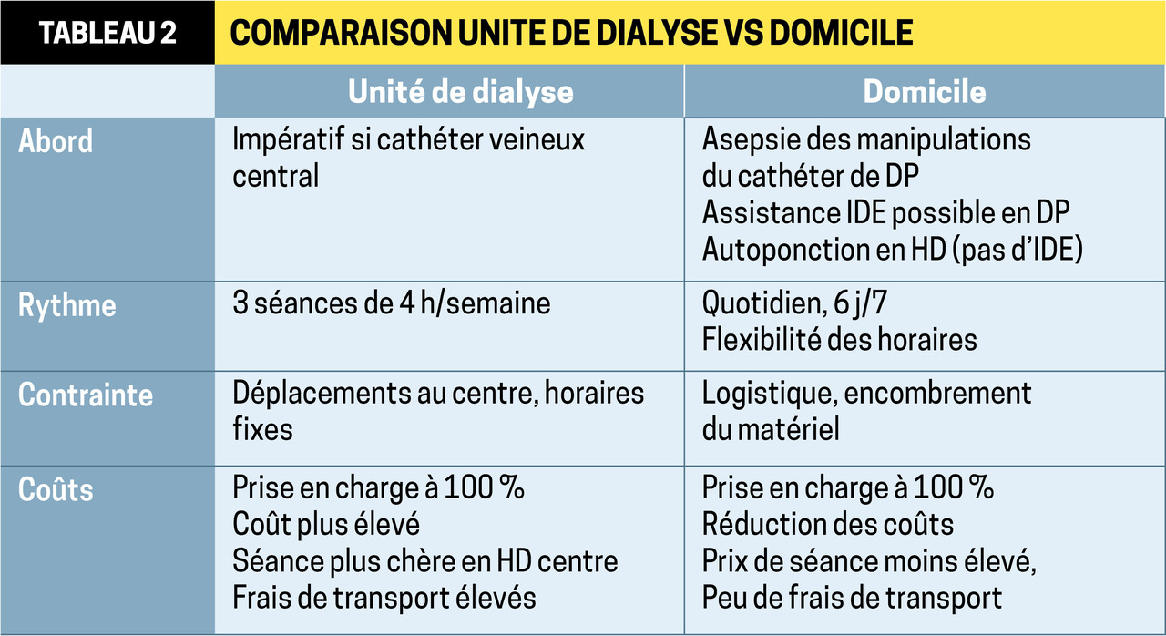 En pratique, le sujet qui opte pour un traitement en établissement de santé sera orienté vers l’HD. Celui qui souhaite se soigner chez lui a le choix entre HD et DP. La sous-utilisation de la DP en France tient principalement à une insuffisance d’information : lorsqu’elle est proposée systématiquement aux malades éligibles aux 2 techniques, elle est préférée dans la moitié des cas.
