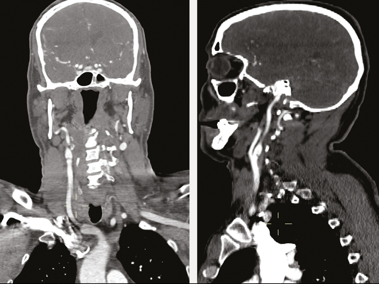 Cet homme de 41 ans, sans antécédent notable, était admis aux urgences pour une hémiplégie gauche d’apparition brutale (H3). Une angio-IRM cérébrale montrait un infarctus frontal et dans le territoire de l’artère sylvienne superficielle et profonde droit (fig. 1 ). Étant donné son jeune âge, un angioscanner des troncs supra-aortiques était réalisé, montrant une image d’éperon caractéristique de diaphragme bulbaire carotidien (fig. 2 ). Le patient était hospitalisé, mis sous traitement médical à base d’anticoagulant à dose préventive et d’antiagrégant plaquettaire en attendant la réalisation d’une artériographie avec mise en place d’un stent.