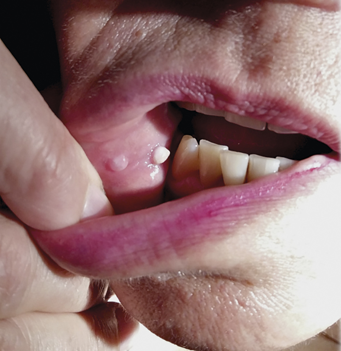 Dans la bouche, 2 nodules blancs isolés (8 mm de diamètre) ont une consistance ferme et indolore. Ils siègent en regard d’un espace entre les dents 42, 43 et 44 qui sont malposées.